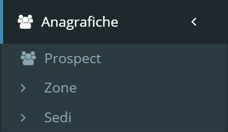 Con lo stesso procedimento sopra descritto, tramite il sottomenu Prospect, sarà possibile creare voci di anagrafiche prospect, mentre tramite i sottomenu Zone e Sedi, sarà possibile creare voci di anagrafiche in base alle zone e alle sedi di interesse.