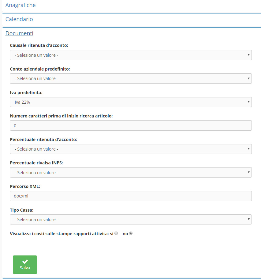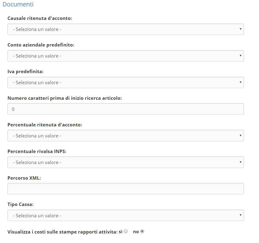 Impostazioni di base per la fatturazione: in Impostazioni troverete numerosi campi da compilare, in base alle vostre necessità, nelle sottosezioni Documenti,