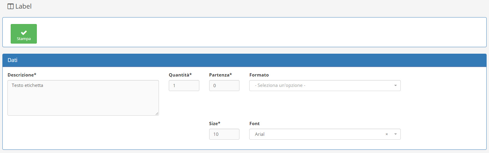 Label: cliccando sulla voce di menu Label accederete ad una schermata che vi consentirà la generazione di etichette personalizzate per i vostri prodotti.